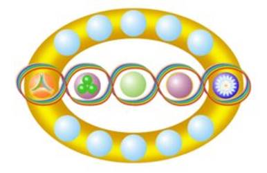 (Пояснения к символу: вокруг Обновлённого символа Объединённого Огня Вознесения выстраивается Волна Первотворения, состоящая из голубых потоков энергий ПервоВоды и из золотых энергий Огня Алтая. В местах пересечения потоков сияет Огонь Любви Творца).