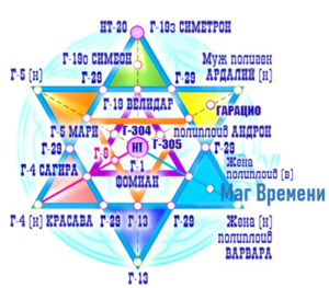 Находясь в Храме, сотворяем голограмму Нового Генетического Центра и перемещаем вновь сотворённый Полиген Маг Времени в Нулевую Точку структуры Нового Генетического Центра. Она перенаправляет Полиген в центр голубого треугольника. Здесь сохраняется энергоинформация темпоральной материи — родной для Полигена дом энергий Времени, Магнетизма и Гравитации (Рис.20).