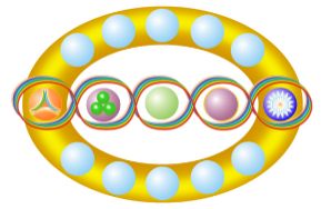 Начинается работа по трансформации наших тел: в наше общее пространство вплывает удивительного цвета живая энергетическая плазменная структура. Она меняет постоянно свою форму, вся текучая, светящаяся и даже озорная! Она входит в общее пространство нашего круга, зависает над нами и вдруг вспыхивает — и рассыпается, разлетается на сферочки по количеству присутствующих, заполняя каждого из нас необычной энергией. Проявляется Волна Первотворения, которая проходит между нашими телами, соединяя их между собой! (Рис. 5) Мы чувствуем колоссальный подъём энергий! Появляется Огненно-Синее Сияние, в него входит Золотая субстанция, окрашиваясь в синие тона, и начинает нитью Волны Первотворения двигаться к пространству Голубого цвета.