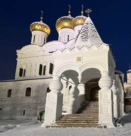 Заходим на территорию монастыря. Кругом всё бело: белые Храмы, колокольня, нарядные царские палаты и строения как будто вырастают из чистого снега, соединяются в единое пространство. Мы попали в мир удивительно чистый, светлый, гармоничный, радостный. Обходим территорию монастыря, настраиваясь на энергии пространства. Обнаруживаем, что многие строения венчаются сферой, на которой стоит крест, и с внутренней стороны ворот встречаем изображение треугольника в сфере, излучающей свет. Для нас эта символика Магнита Костромы.