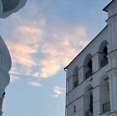 И вдруг ... пространство почти молниеносно отзывается: в густо затянутом плотными облаками небе прямо над нашими головами неожиданно появляется круг чистого голубого неба и на нём нежные розовые облачка, хотя со всех сторон вокруг облака оставались безпросветно плотными. Как будто луч нежности Матери был послан нам. Благодарим!