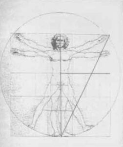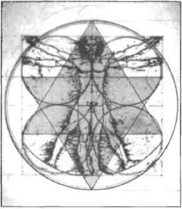 Если вы стоите на выпрямленных ногах, вытянув руки в стороны, то вокруг вашего тела формируется квадрат или куб, как это показано на рисунке Леонардо. (Рис. 5. Леонардо да Винчи. Изображение человека.)