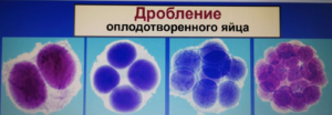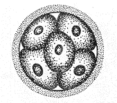Фото. Первые стадии сегментации яйцеклетки. На третьи сутки в оплодотворённом яйце появляются 8 первоклеток.