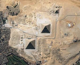 Слева направо: пирамиды Микерина, Хефрена и Хеопса. Три небольшие пирамиды на переднем плане — это пирамиды-спутницы пирамиды Микерина.