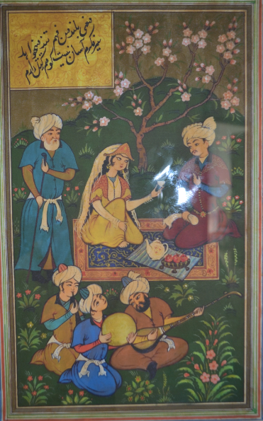 Мы втроем с подругами на территории музея решали вопрос о гиде, чтобы получить полноценное представление. И вдруг на русском языке к нам обращается мужчина, узбек лет 60-ти. У него табличка с его именем на груди. Значит это работник музея. И мы дали согласие, чтобы он был гидом для нас. Вскоре беседа перешла на несколько иную тему, чем история обсерватории. Этому послужил небольшой красочный подлинник – написанный красками сюжет, в котором девушка, находясь в роскошном саду, левой рукой подает пиалу молодому человеку.