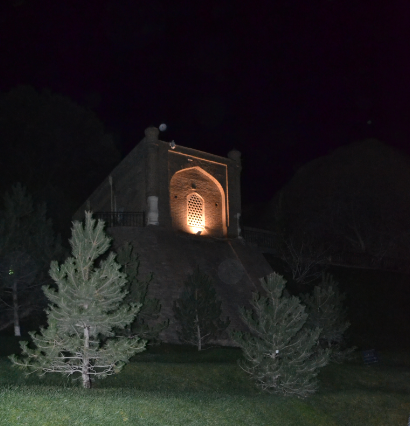 Уже стемнело, мавзолей был закрыт. Наш гид Умид попросил лично для нас открыть вход. И все это пространство, в опускающихся сумерках, открылось для нас как некое волшебство. Представьте себе: довольно крутой склон, лестница, ведущая вверх к мавзолею, кованые кружевные заборы, врата и сам мавзолей в глубочайшей тишине на фоне первых звезд в небесах! На территории из чудного резного дерева выполнены беседки в восточном стиле – на низком настиле во время отдыха можно возлежать на подушках. И одинокая фисташка, которой больше 600 лет. Если посмотреть вниз, то там открывается панорама огромной, в парковом стиле территории, которая в дневное время и сезон активного туризма заполнена людьми, стоящими в очереди, чтобы подняться к красивому длинному пятикупольному зданию, где покоится прах Святого Даниэля – пророка, потомка по линии Соломона.