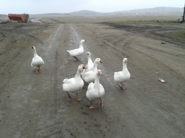 Утром второго дня, 15.10.16, вдвоем с Зоей пошли за камнями. Только вышли из своего домика, а нам на встречу идут 7 белых гусей, а за ними, еще группа – 4. Всего 11.