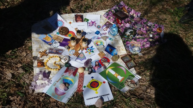 Те, кто впервые приехал к Дубу, знакомились с ним. Он, как всегда, был очень рад и ласков с каждым. Марина Бриллиантова окропила его водой из семи источников, сокровенного места своей области, которое также имеет друидические корни. На физическом плане листья нашего Дуба ещё не распустились, но все увидели его зелёные многомерные ветви. С нами постоянно на контакте был Рамелиус, Верховный Жрец Огней Вознесения. Появились три Мудреца, с которыми мы когда-то познакомились на этом месте, - Архат, Арбат и Аркат. Мы сделали алтарь. Как рекомендовал Рамелиус, зажгли три свечи.