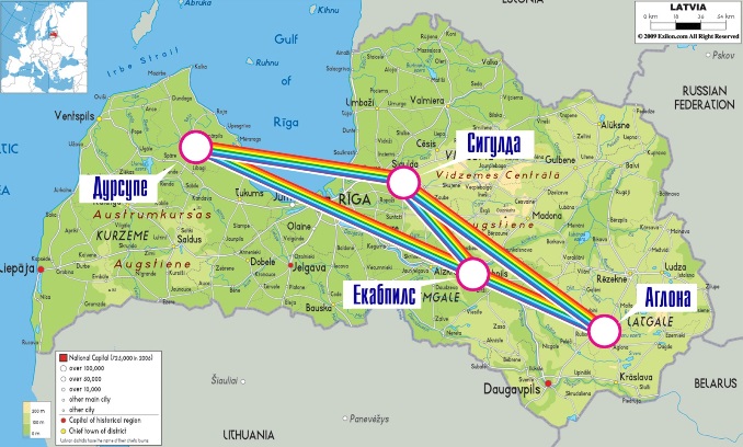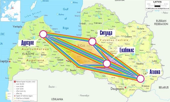 Давайте сделаем следующим образом – такие же потоки радужной энергии направим в Сигулду из точек: Дурсупе, Екабпилс и Аглона. Три потока замыкаются на «Крыльях лебедя» и в Кристалле Иисуса (Рис.1.).