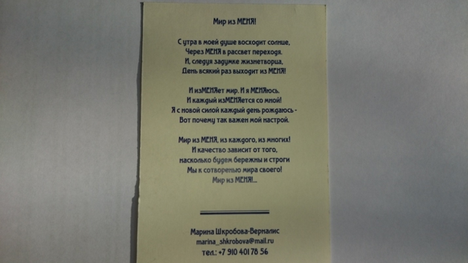 На творческий вечер я собиралась, наблюдая себя со стороны, т.к. ум мне говорил: «Куда ты собираешься? Посмотри какая погода, метет за окном! Дома тепло и уютно!», а тело мое собирается, одевается, наводит макияж! Чувствую, моя душа зовет на творческий вечер!