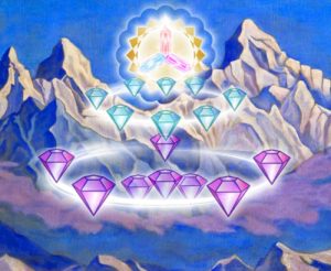 Средний уровень, который по спирали включает следующие восемь Кристаллов, связан уже с высотами Духа, которые человечеству предстояло нарабатывать, вершины, на которые предстояло восходить человечеству постепенно, шаг за шагом. И верхние три Кристалла – это тот самый Ключ к Шамбале – выход к Вершинам Духа. Это Пик возможностей земного человека в духовном развитии. Это то, что смогли совершить Рерихи на своём пути к Шамбале. Именно этим Ключом -достижениями своего духовного потенциала — они смогли открыть дверь в Шамбалу и встретиться с её представителями, принять максимально возможные для людей высокие Огненные Энергии, предназначенные нашей Планете и Человечеству, и проявить Божественное на Земле.