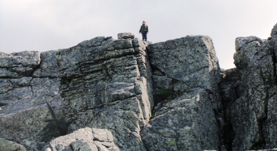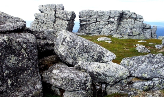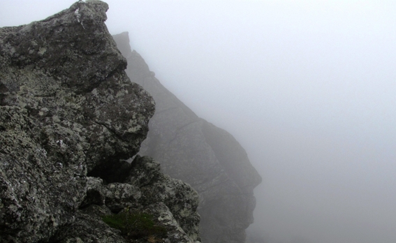Дошли! В голову вошли и крутились двое суток стихи: « На горе Фернандо - по, где гуляет Гиппо-по по широкой Лимпопо»… Не смотря на туман, начали подъём на плато. Всполохи малинового света и молнии без грома у подножия и сильный ветер вверху, встретили нас. Белизна кварцитовых сланцев прикрыта лишайниками. В тумане начали своё путешествие среди кубов, плит с прямыми углами, скульптур зверей…