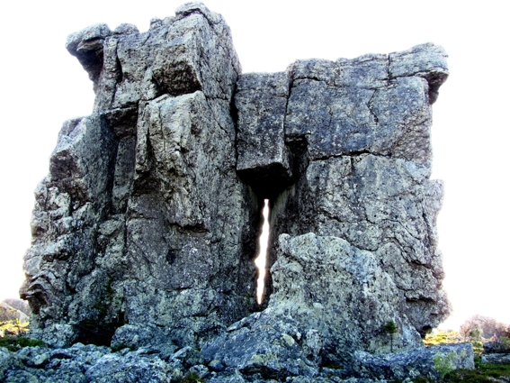 Яркое Солнце наполнило Радостью всё плато – захотелось остаться здесь жить. Вновь обходили шедевры архитектуры. Подошли к ВОРОТАМ. Позднее мы узнали, что перед ними в 1926г стояли деревянные идолы Вогулов (манси) и место почиталось как святилище. В левой части Ворот виден воин с мечом, а справа – профиль женщины.