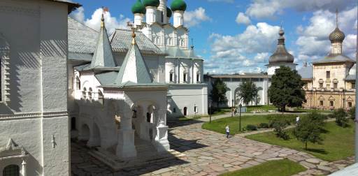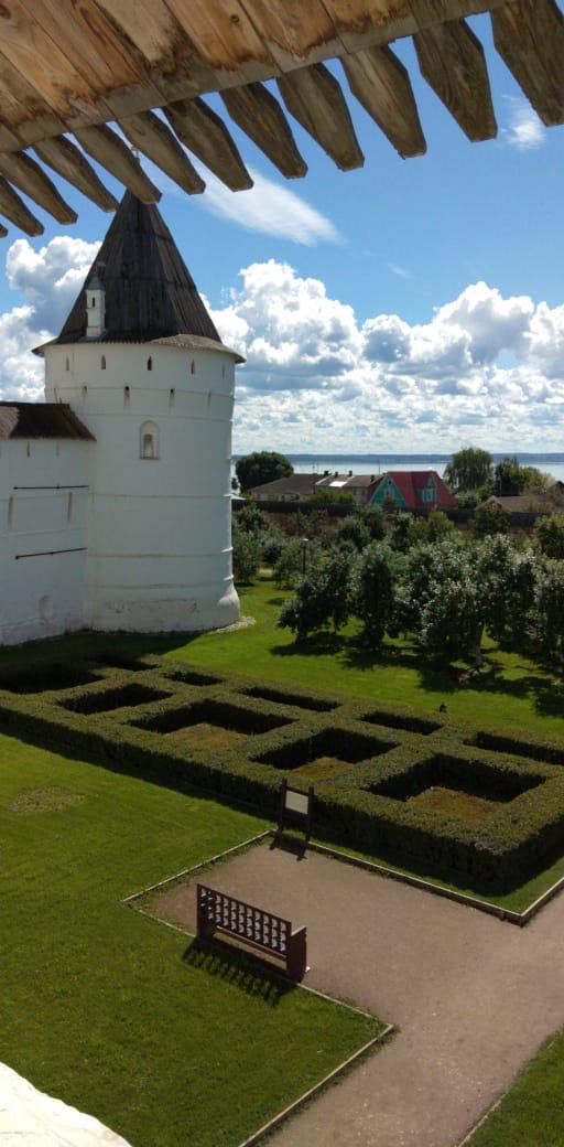 Первая наша остановка была около Спасо-Яковлевского мужского монастыря. Монастырь с мощными стенами, полный цветов, тепла и наполненный людьми. Интересное и необычное ощущение уюта. Посреди зелени монастырского двора расположился источник воды, навстречу попадались монахи или служители, пропалывающие клумбы, мимо провезли тележку со свежеиспеченным хлебом. На одной из башен флюгер в виде ангела. Идиллия... 18-19 веков. Нам было интересно подняться на смотровую площадку, но из-за раннего часа все ещё было закрыто. Около стен расположился рыночек для туристов и очень сладкоречивые попрошайки. Мы обошли стену и вышли на озеро Неро. Древнее ледниковое озеро. Нас поразила его первозданная не ухоженность. Ростов расположен вдоль озера, но нет ни набережной, ни проминада, трава не кошена. Туристы бредут по проселочной дороге, уворачиваясь от проезжающих машин. По озеру туристов катают на катамаране и можно взять лодку на прокат, но купаться нельзя, очень илистое дно. Причём ил ценный и лечебный. По легенде, на дне озера Неро находится легендарный Китеж Град. Но в этот раз он не дал о себе знать. Только описывая наше путешествие и уточняй названия, я наткнулась на эту информацию.