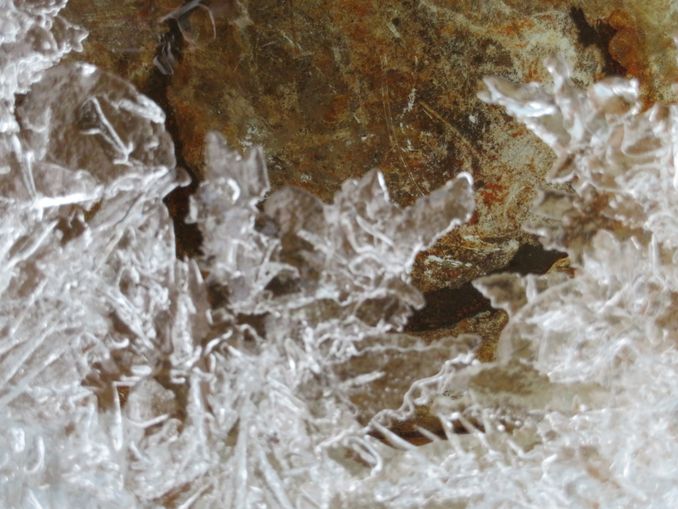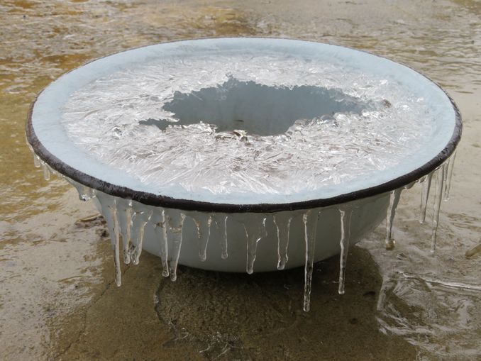 И три фото - Его Величество Тазик: замёрзла вода в тазике, накапавшая с крыши. Сам Тазик - сбоку в ледяной короне и взгляд в его глубины.