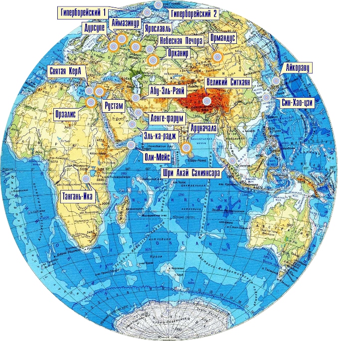 РИСУНОК № 1. СХЕМА РАСПОЛОЖЕНИЯ ХРАМОВ В ВОСТОЧНОМ ПОЛУШАРИИ ЗЕМЛИ. Места материальной привязки обозначены символом "Сфера трёх Огней". Оранжевая оболочка вокруг символа указывает на то, что Храм был активирован до 3 мая 2015 года.