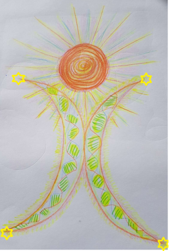 Жрица Мелиса Лаэртина, как Луч Марии Магдалены, проявляет аспект Божественной Женственности и посылает из своего Сакрального Сердца Божественную Искру в форме прекрасной кристаллической Звезды нежного розового цвета. Идёт соединение двух Лучей Божественной Мужественности и Божественной Женственности в прекрасной Хромосоме.