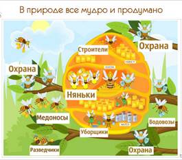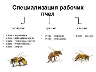 Взаимоотношения в улье можно считать эталоном большой семьи: все обязанности четко распределены между членами роя. В семье у пчёл наблюдается строгая иерархия. Все подчиняются матке. Обязанности в семье строго распределены. Это обеспечивает порядок и быстрое выполнение всевозможных работ. Дело трутней - оплодотворение матки. Рабочие пчёлы выполняют множество функций.. Вход в улей надежно охраняется сторожами. Подлетая, пчела открывает специальное углубление тела и предъявляет запах стражам как свою визитную карточку. При необходимости, совместно защищаются от врагов.