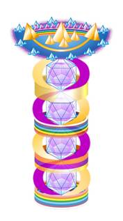 Храм предстает перед нами высокой сияющей башней, вершина которой теряется в радужных энергетических потоках, льющихся во все пространство.