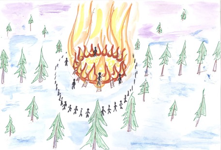 Рис. 1 «Посвящаемые» поднимаются на край чаши с «золотой лавой» - «амритой» для последующего окунания. Остальные члены группы в хороводе вокруг поддерживают их. Все это происходит в заснеженном священном лесу.