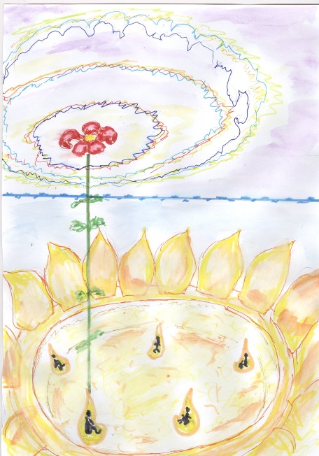 Что важного и существенного происходило во время нашего пребывания здесь? Из каждой капсулы-почки – как стрелка лука прорастает из луковицы – вырос тонкий длинный стебель ростка, который дорос до ближних небес (то есть прошел сквозь какую-то преграду в иную реальность) и здесь раскрылся алым цветком наподобие мака. Он раскрывался бесконечно, снова и снова давая новые малиново-алые лепестки, этот сказочный «Аленький Цветочек» - символ беспрестанно рождающей силы Новой Земли. Ибо это было ее Пространство, ее Небеса-энергия.