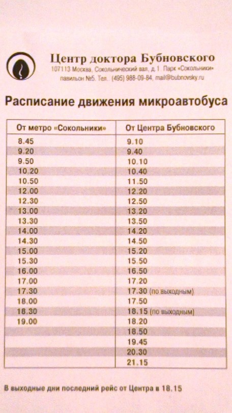 Встать спиной к зданию метро, лицом к парку Сокольники. Повернуть направо и перейти дорогу с односторонним движением. Повернуть налево и дойти до столба с часами около автобусной остановки. Информацию о маршрутном такси на остановке вы, скорее всего, не увидите (её постоянно заклеивают), пусть это вас не смущает. Под часами останавливается (ПРОВЕРЕНО!) маршрутное такси с надписью – Центр доктора Бубновского (бело-зеленое или белое). Доехать до конца, маршрутное такси подъезжает ко входу в Центр доктора Бубновского. Время в пути 10 минут, стоимость проезда – 30 рублей. Обходите здание справа, входите в первую дверь и поднимаетесь на второй этаж в Конференц-зал (слева от лестницы). Маршрутное такси ходит по расписанию: