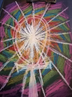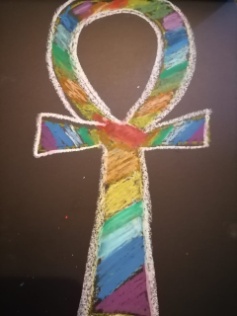 Елена Трещинская: Попробовала изобразить то, что увидела сразу на занятии, но, конечно, краски темноваты. В общем, я увидела в петельке Анкха ИСТОЧНИК РАДУГ, сияние такое светлое! В каждом радужном луче цвета располагались как бы наискосок. Мне чувствуется, что каждый из нас - такой мощный именно Радужный Луч. И захотелось изобразить Радужный Анкх: