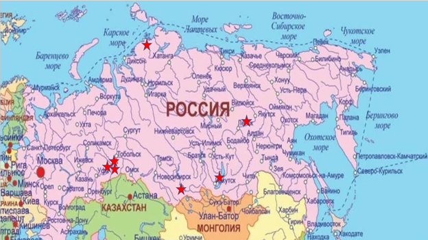 Рисунок №2. На карте России Семь Мест Силы, ответственных за сотворение Гармоничного Коллективного Сознания людей мира Радуга.