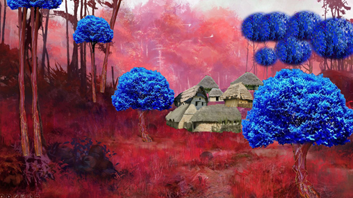 Горден через Свету: С земли, то есть красные поля, красно-голубоватые деревья. Само дерево, оно красное, а листья у них такие голубые, как волшебные.