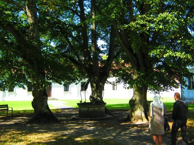 После этой работы мы вышли во внутренний двор монастыря, увидели, что там находятся два колодца, возле каждого растет по три вековые липы. Опять трехлистник?! Над колодцами сооружена сфера из четырех дуг. В голове складывается мозаика: 4 стихии, 4 стороны света, 4 - символ Аркаима.
