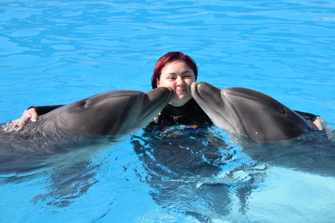 Первая встреча прошла в дельфинарии с дельфинами по имени Саша, Стив и Маша.