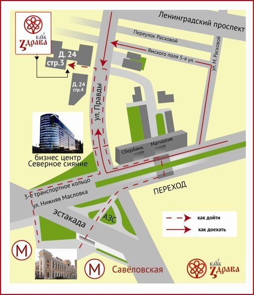 Как добраться: м. Савёловская, 1- ый вагон из центра. В переходе налево. Подняться на поверхность, повернуть налево, по правую руку будет магазин "Терволина". Перейти по светофору дорогу, пройти под мостом, с правой стороны будет заправка. Далее - прямо, пройти еще одну дорогу по "зебре", и с левой стороны будет подземный переход. По нему пройти до конца и выйти налево. Пройти 15-20 метров и повернуть направо, вы - на ул. Правда. Ориентир - красивое синее стеклянное здание Бизнес-центра (на первом этаже японский ресторан «Ичибан баши»). Перейти дорогу напротив этого здания (на сторону, где оно стоит). Идти вдоль него, затем вдоль следующего здания («Российская газета»). За зданием «Российской газеты» немного в глубине, торцом стоит здание N 24 стр.3. Вход один. Вывеска с адресом прямо над входной дверью. За охранником повернуть налево, дойти до лифта. Подняться на 4 этаж и прямо по коридору до стеклянных дверей. Клуб Здрава с левой стороны.