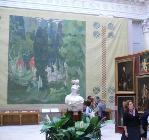 Я встала и подошла к именным костюмам из различных спектаклей. Повеяло теплом артистов, выступавших в этих костюмах на разных сценах мира. Потом, переходя от рисунка к картине, мы стали совместно – Лев Бакст и я - в едином коконе перемещаться по выставке. Занавес «Элизиум» приковал моё внимание. Элизиум в античной поэзии место блаженства, рай. Но меня поразило оформление занавеса. С двух сторон по краям расположены торы. Группы торов справа, слева, сверху, снизу. Между торами вертикальная полоса, как часть рисунка шахматной доски. Ты попадаешь в другой мир через эти торы, квадратики. И попадаешь в рай. Вот часть этого занавеса.