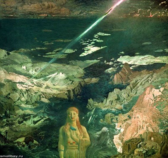 Картина «Древний ужас» создана художником после неоднократного посещения Греции. На полотне Леона Бакста, невзирая на временные рамки, мирно сосуществуют и памятники культуры древней эгейской культуры, и произведения искусства Классической Греции. Центральным композиционным объектом стала статуя богини Афродиты, держащей в руке голубя. За ее спиной видна катастрофа, уносящая некую цивилизацию (быть может, Атлантиду?) в небытие. Может быть, художник хотел показать неотвратимость гибели старого уклада для обретения новых идеалов и целей? – из описания картины. Да, я тоже прочувствовала на картине разрушение, уход старого мира. И перед нами Мать Мира с голубым голубем, вносящая в мир Земли новые энергии Преобразования. И луч Света – молния Творца активно принимает участие в этом созидательном процессе.