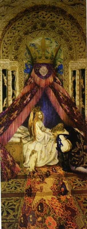 Когда мы подошли к этой картине, я ощутила своё присутствие в ней. Она была объёмна. В ней текла новая жизнь. Корона над балдахином несла энергии Вознесения. Идёт посвящение в новую прекрасную жизнь. Ковёр перед кроватью – птица Феникс – Возрождение в новых энергиях. Вознесение. Идёт соединение с мирами, Галактиками, Вселенными.
