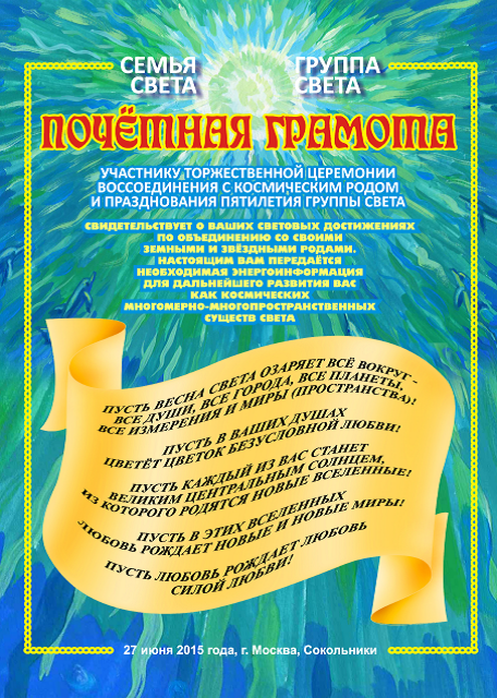 Благодарим Виктора Трухина, главного художника Журнала «Мировой Ченнелинг», создавшего макет грамоты (см. выше).